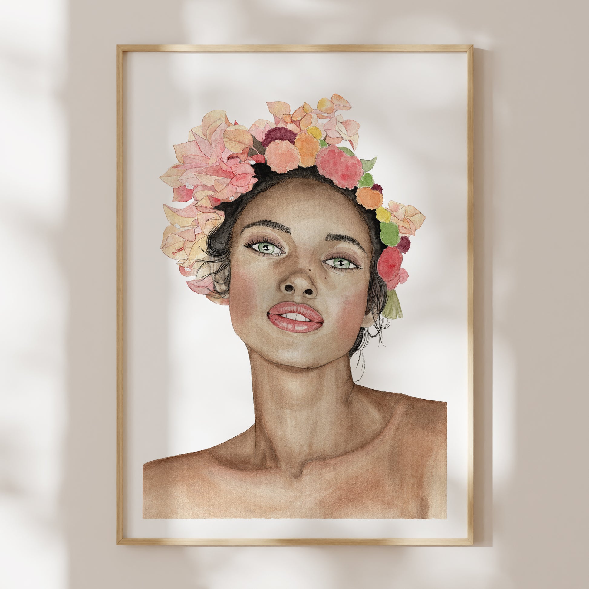 Portrait of a beautiful woman wearing a flower crown. The portrait is inspired by a photograph of model Ava de Lacy (permission to use as reference photo granted by photographer Amberly Valentine).