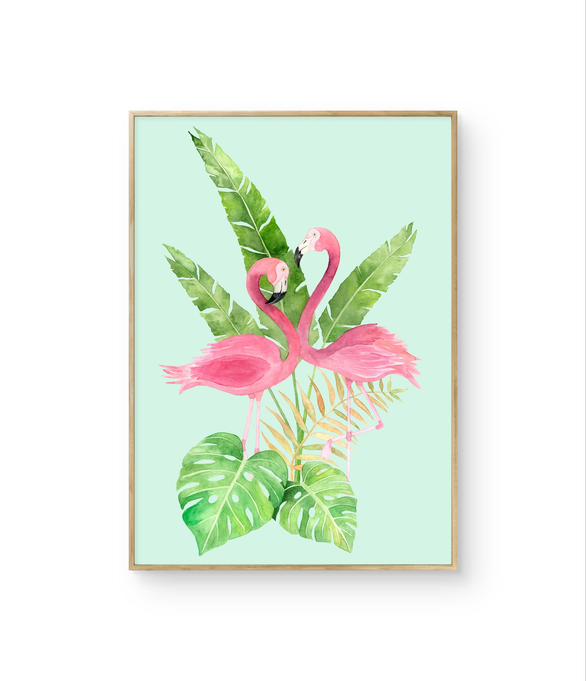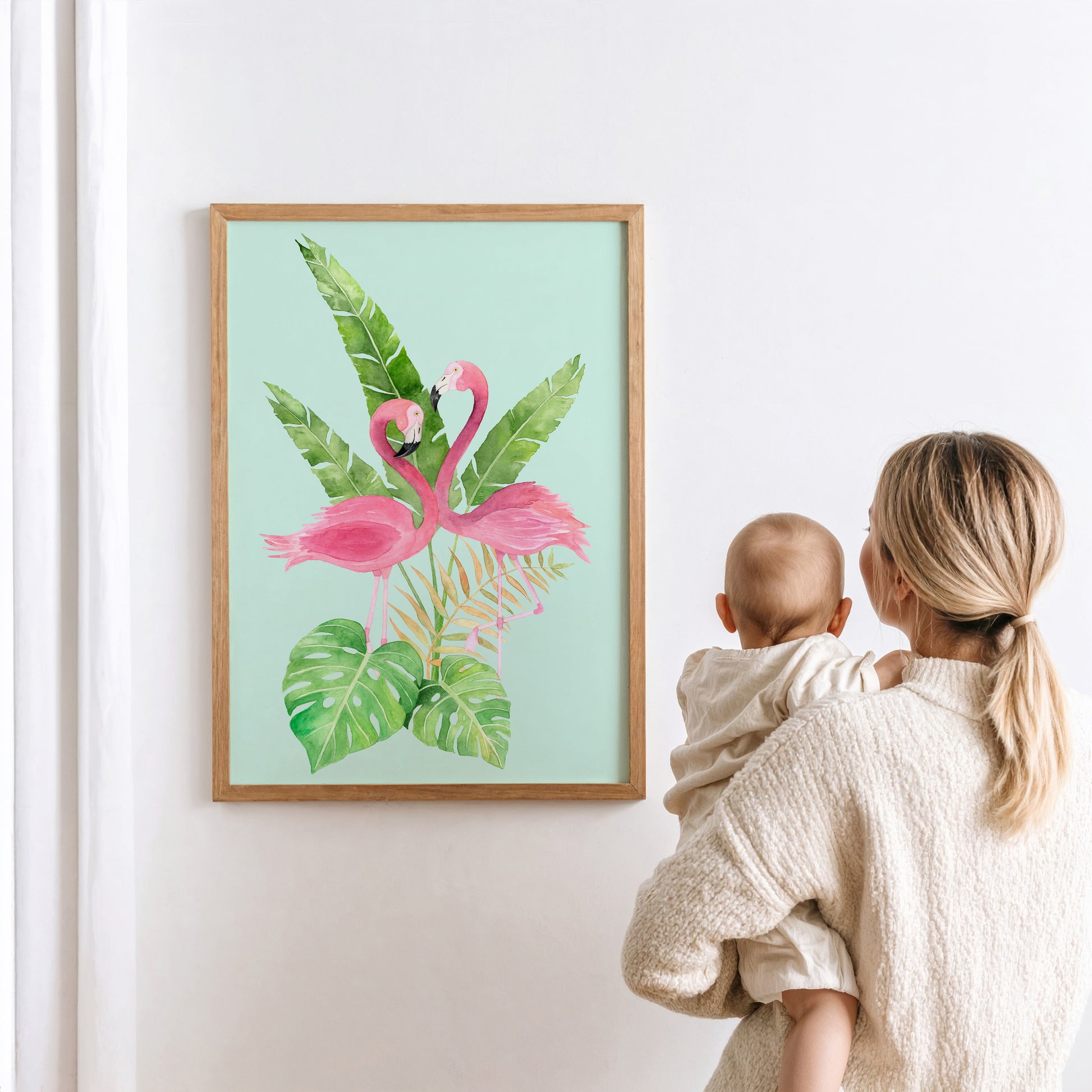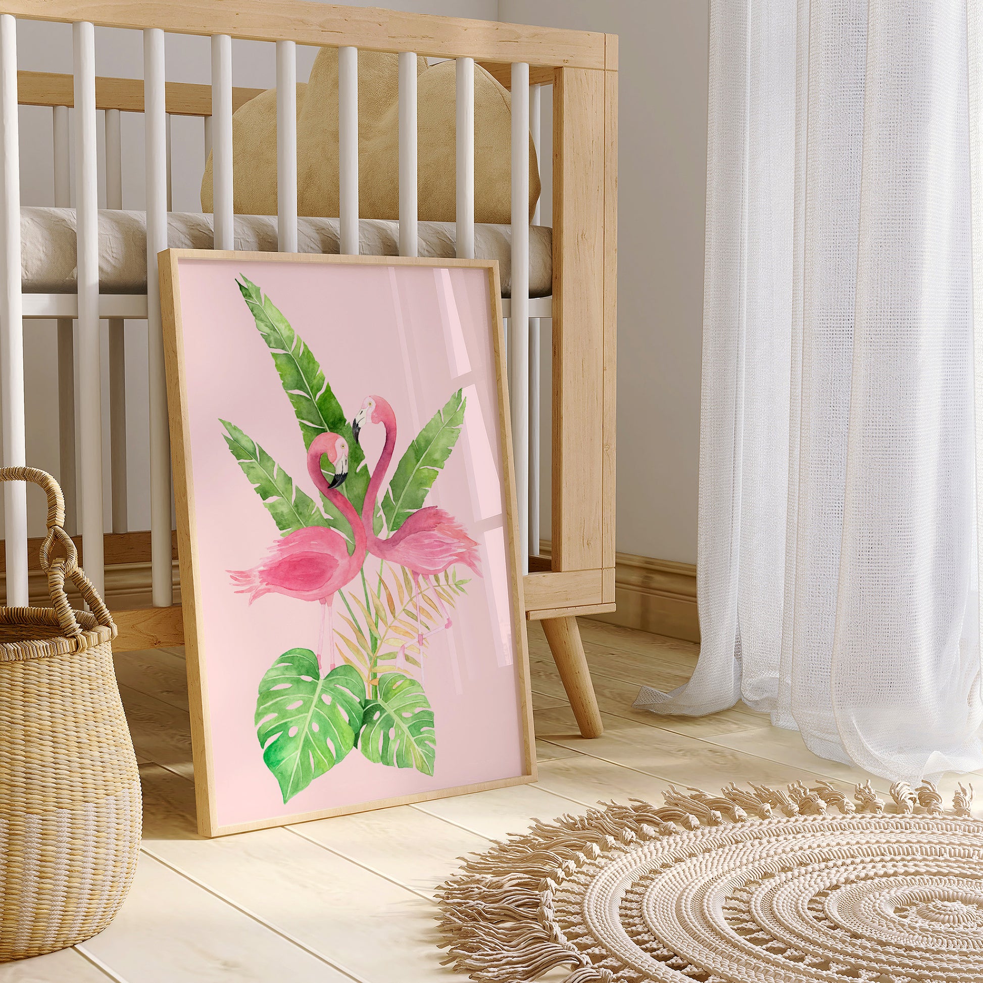 Add a splash of colour and tropical charm to your child's room with this playful flamingo poster. Painted with watercolours in bright pinks and soft purples, these two flamingos form a heart shape with their necks, surrounded by lush tropical leaves in vibrant green tones. A joyful and eye-catching piece that sparks imagination and brings nature indoors.