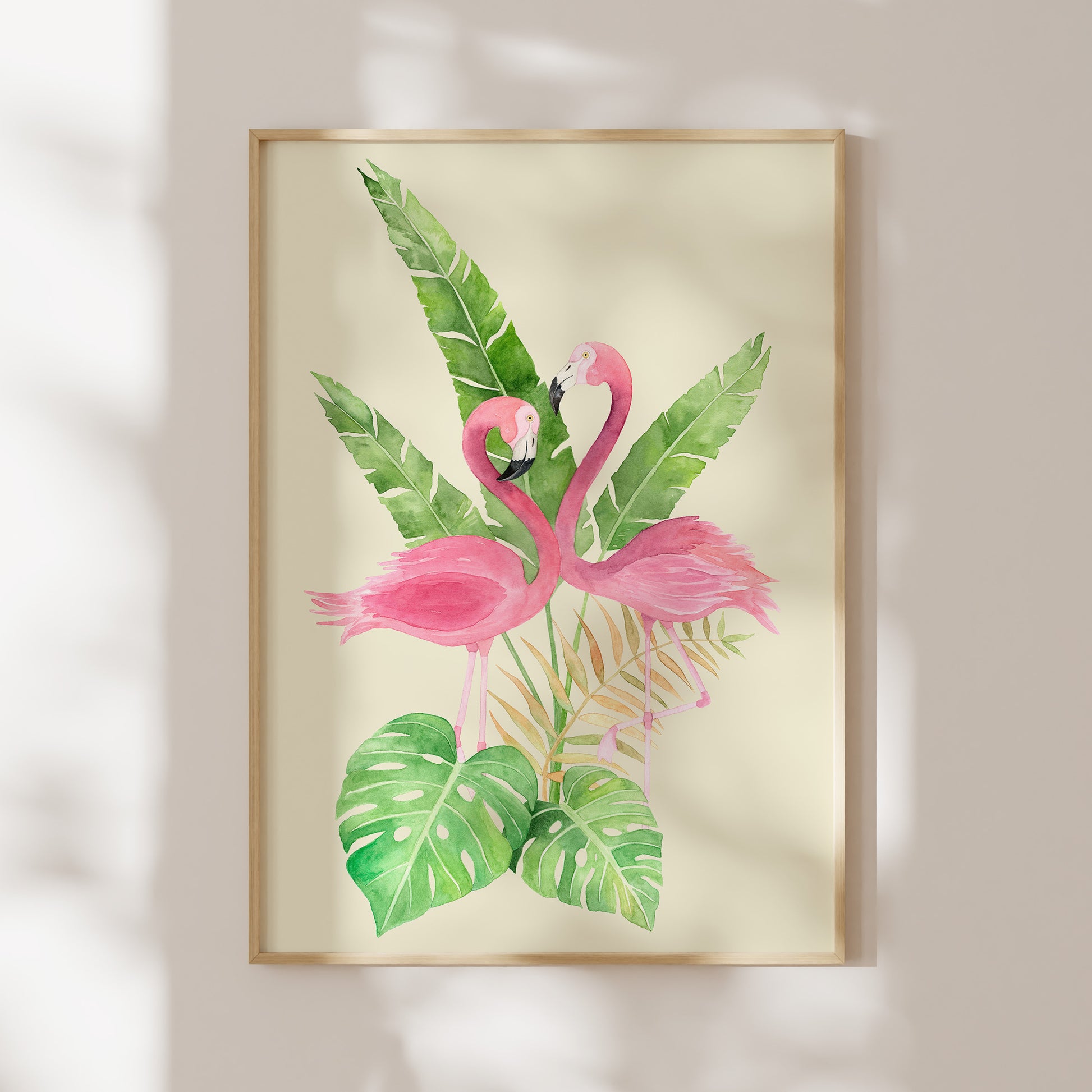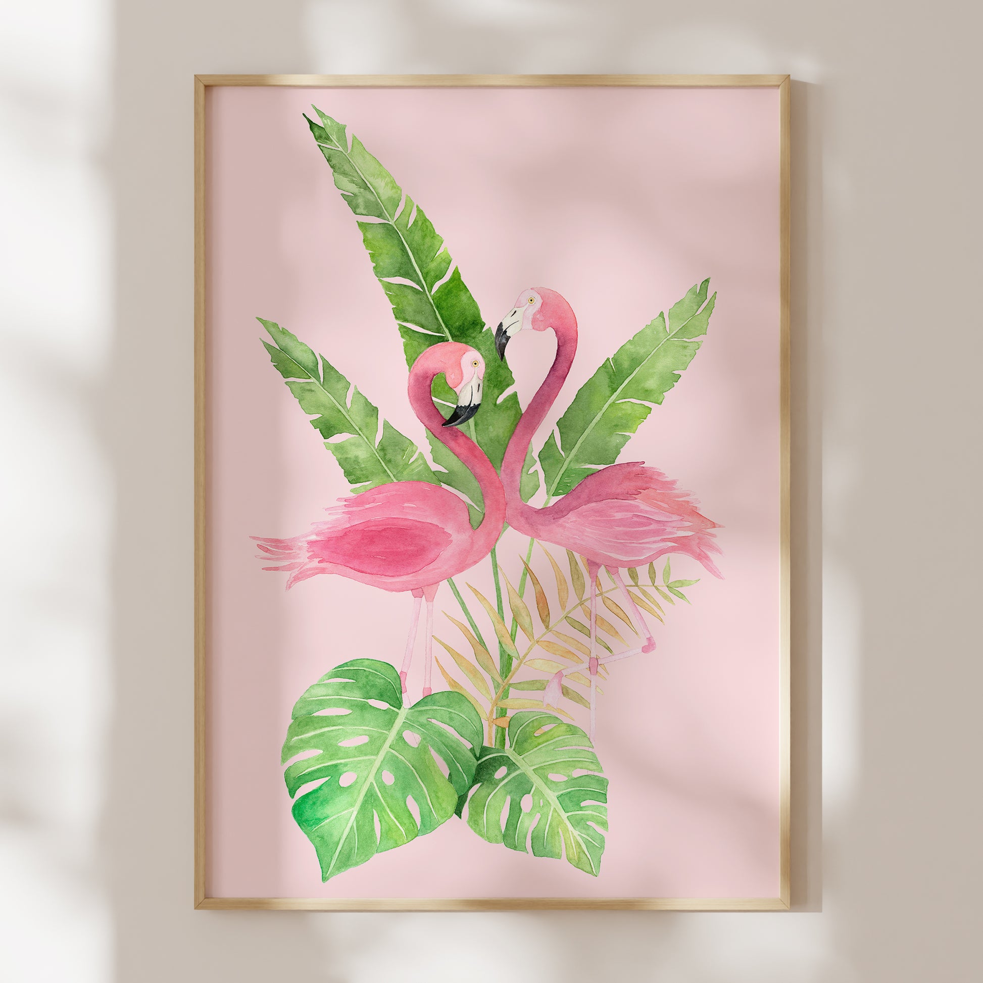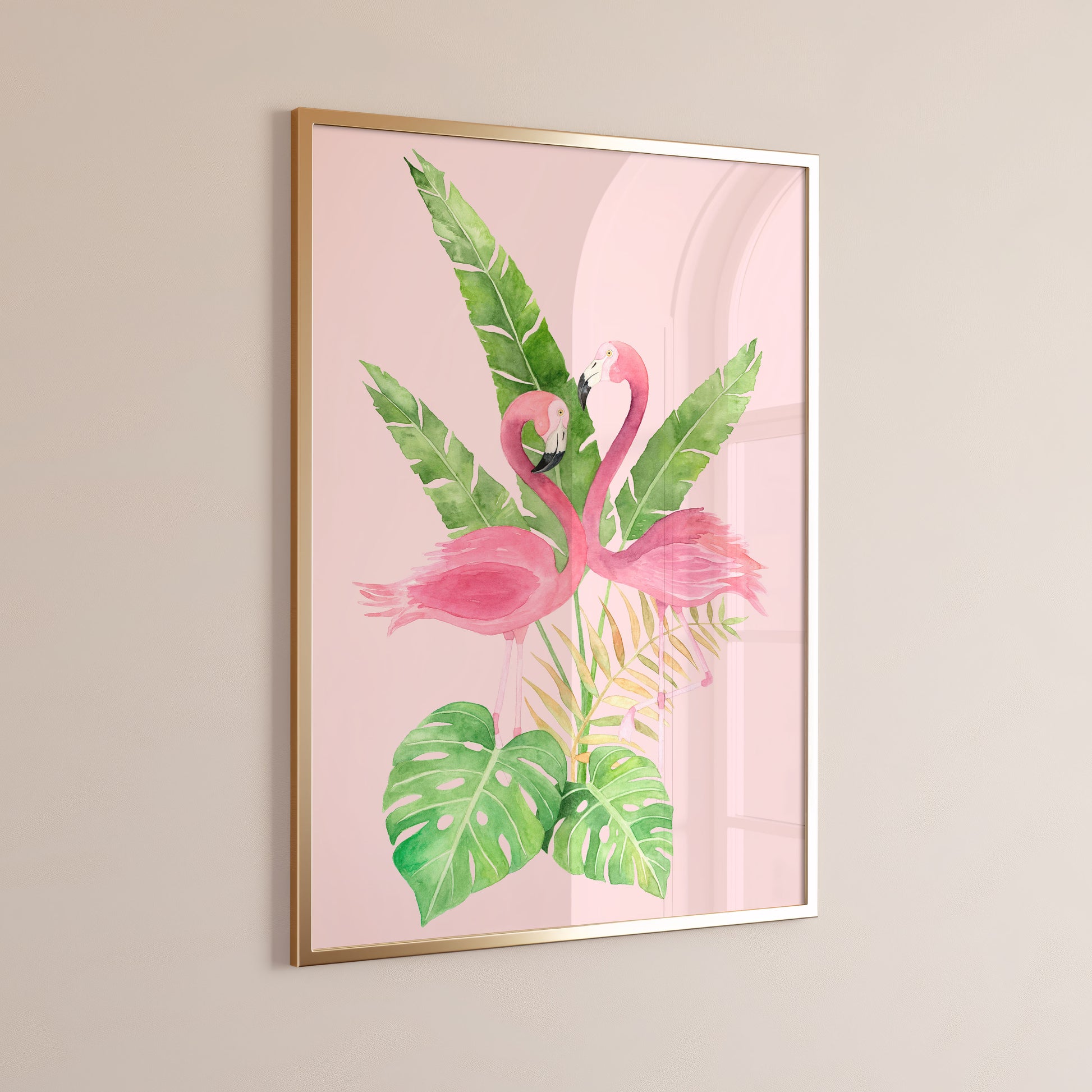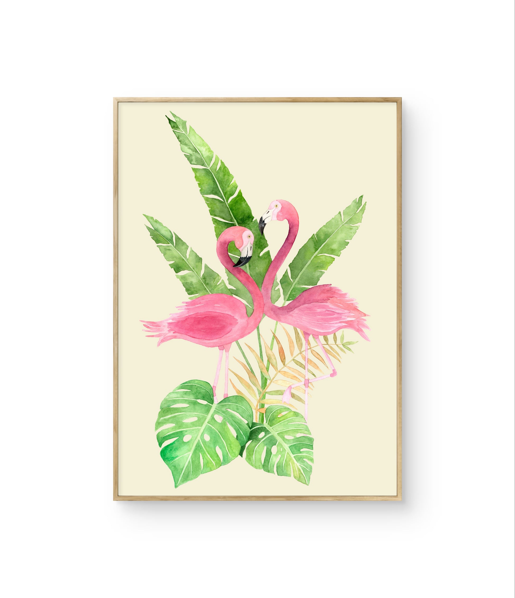 Add a splash of colour and tropical charm to your child's room with this playful flamingo poster. Painted with watercolours in bright pinks and soft purples, these two flamingos form a heart shape with their necks, surrounded by lush tropical leaves in vibrant green tones. A joyful and eye-catching piece that sparks imagination and brings nature indoors.