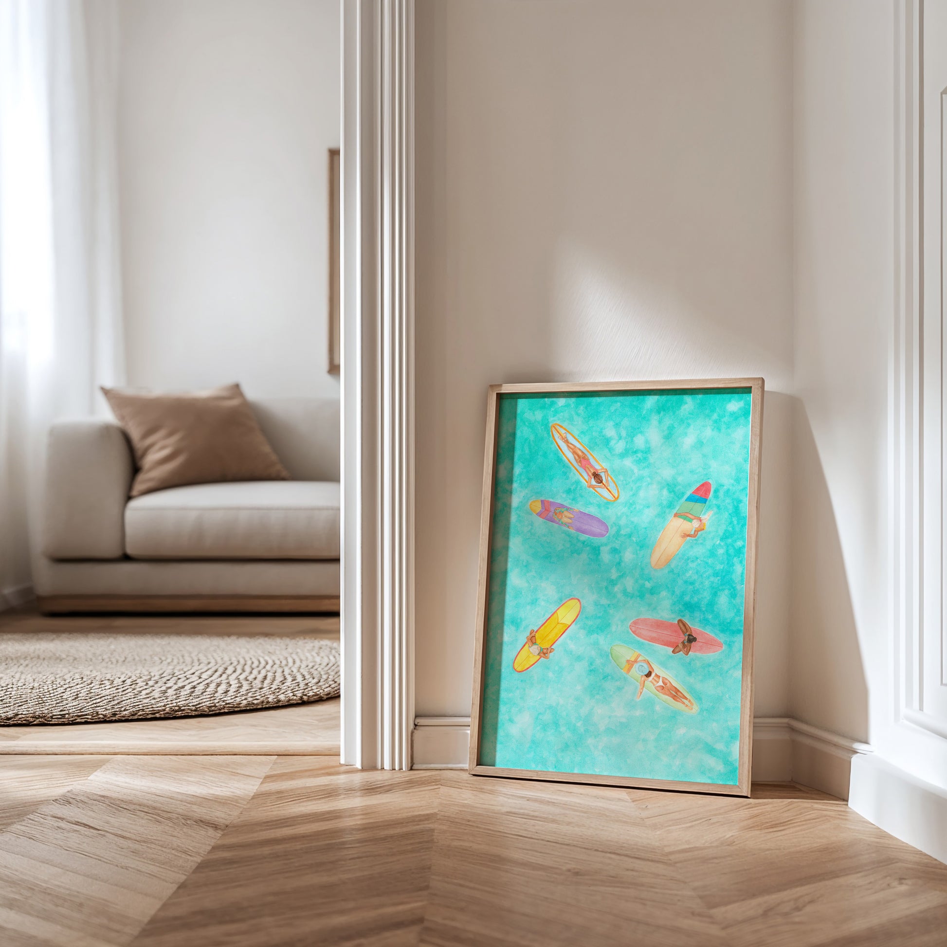 Giclée art print of original watercolour painting "Friendships and Waves". An aerial view of women surfers on longboards, waiting for the next wave.