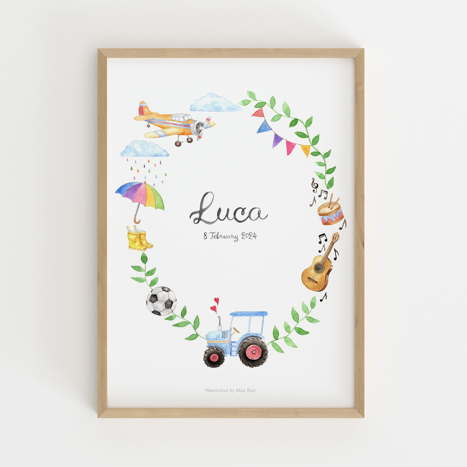 Celebrate the joy of childhood with this charming name poster, designed to bring a touch of whimsy and wonder to any child's room. This enchanting print features a delightful collection of things every child loves, beautifully painted in soft watercolours.