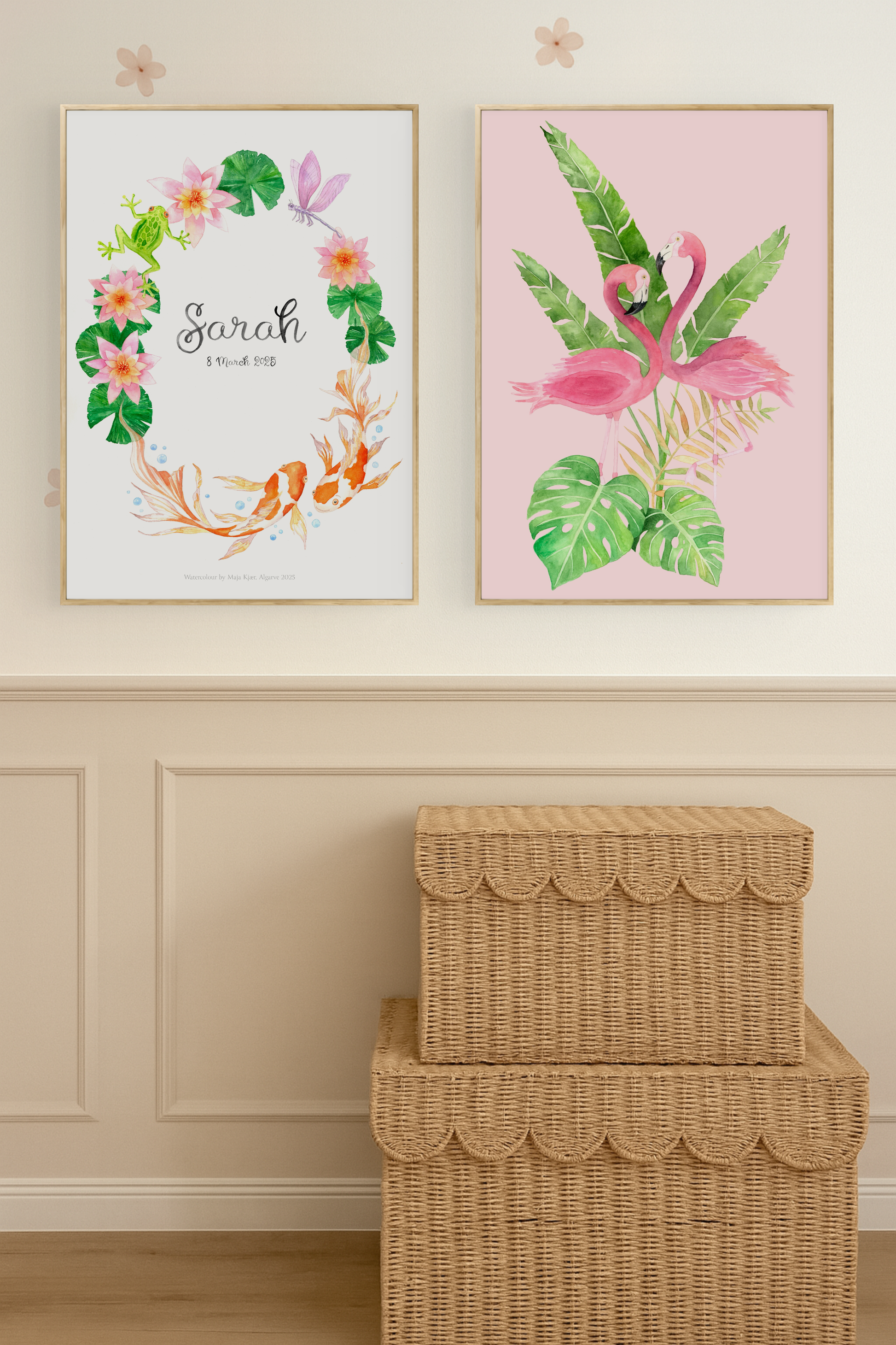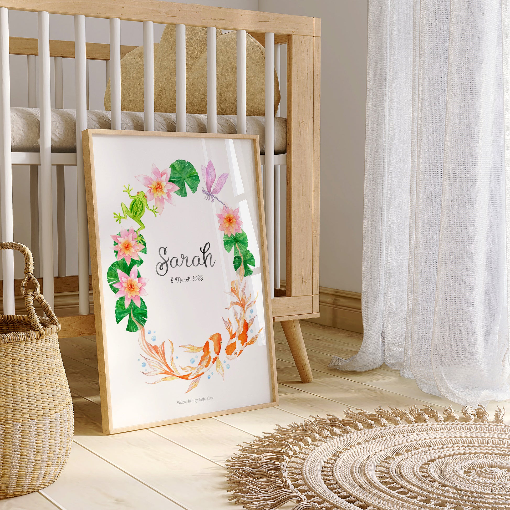 A gentle and dreamy addition to your little one’s room, this personalised Pisces poster captures the magic of this intuitive water sign. Two orange and white koi carp swim gracefully in opposite directions, symbolising the dual nature and deep emotional world of the Pisces child. Surrounded by soft pink water lilies, a delicate purple dragonfly, and a curious green frog, this artwork brings a sense of peace, wonder, and connection to nature.