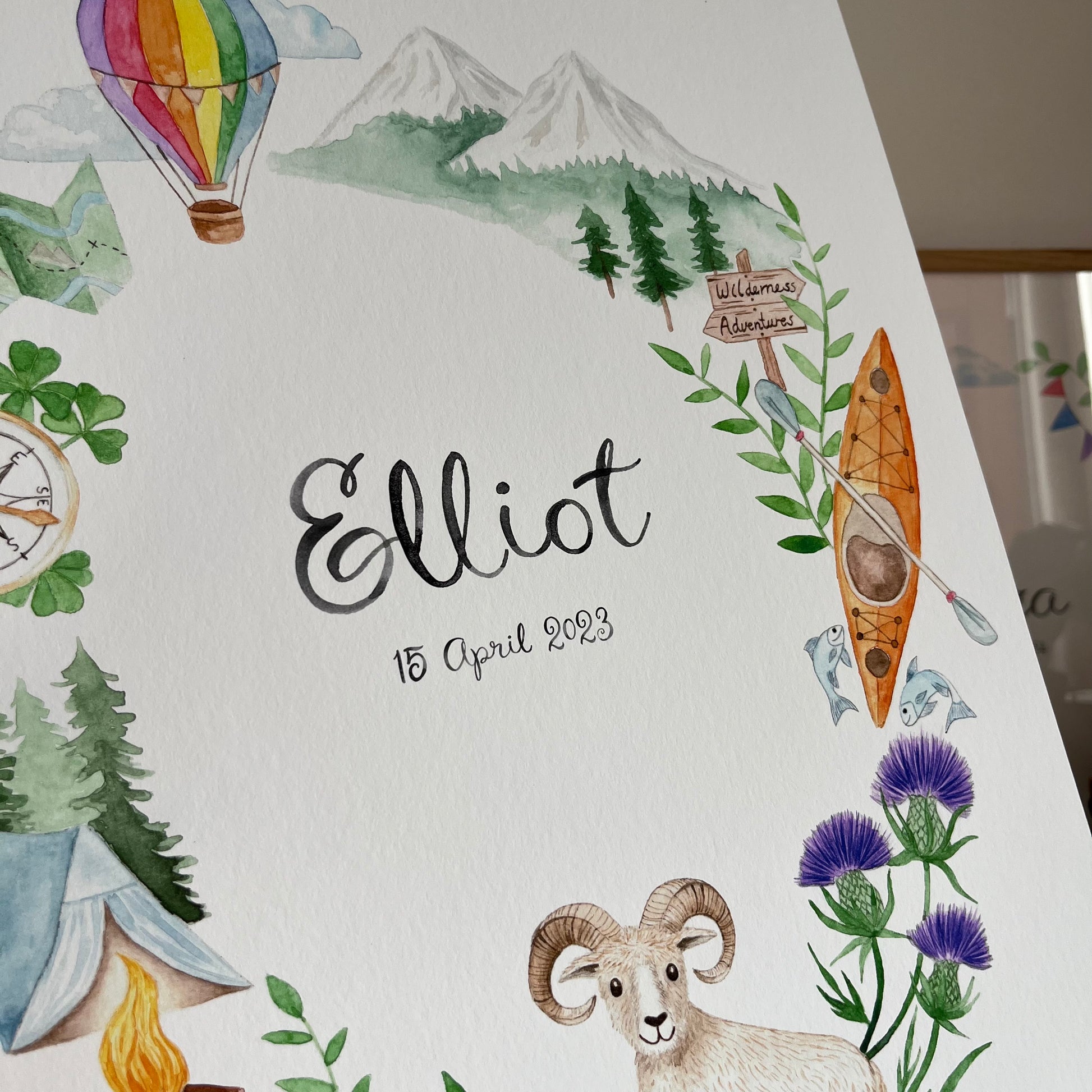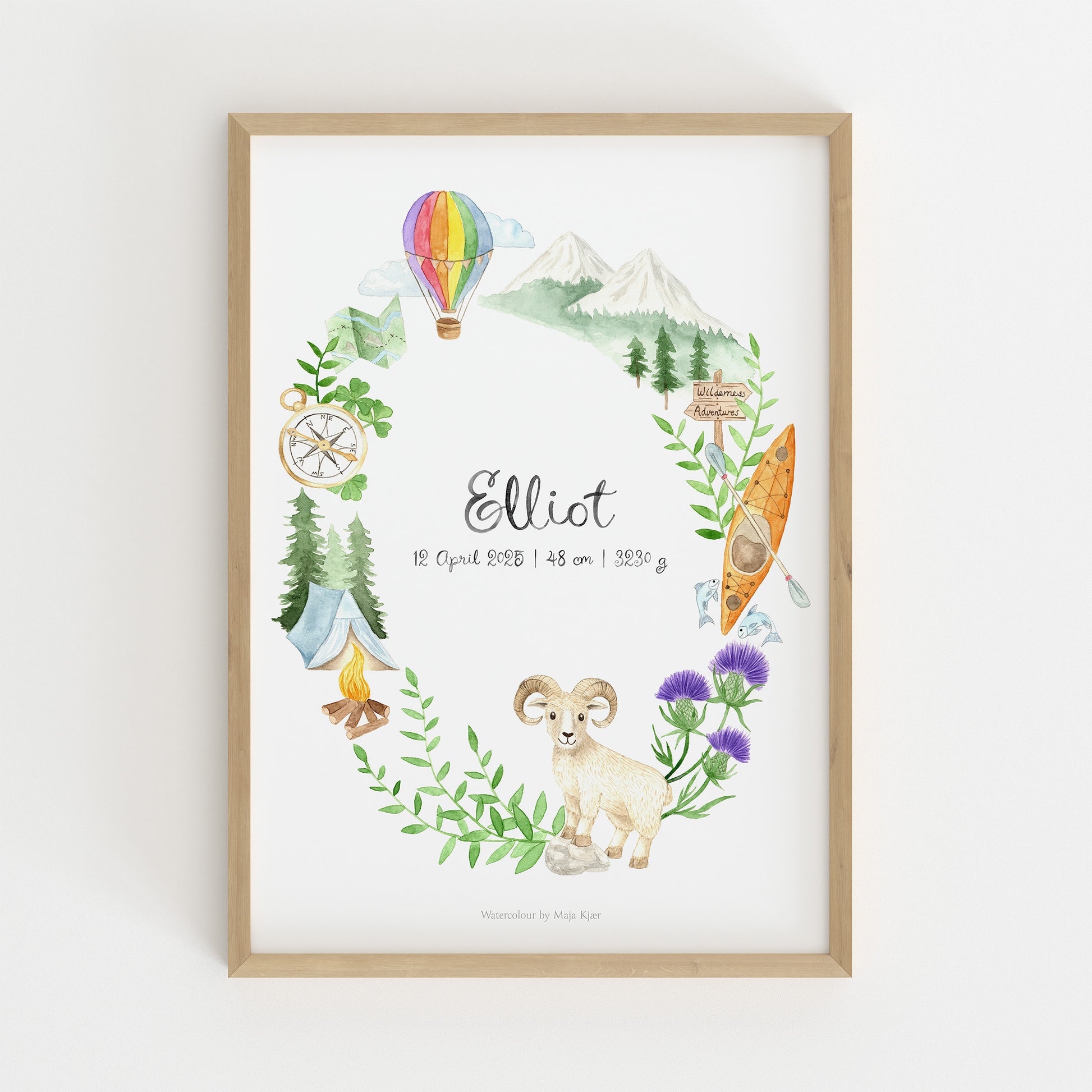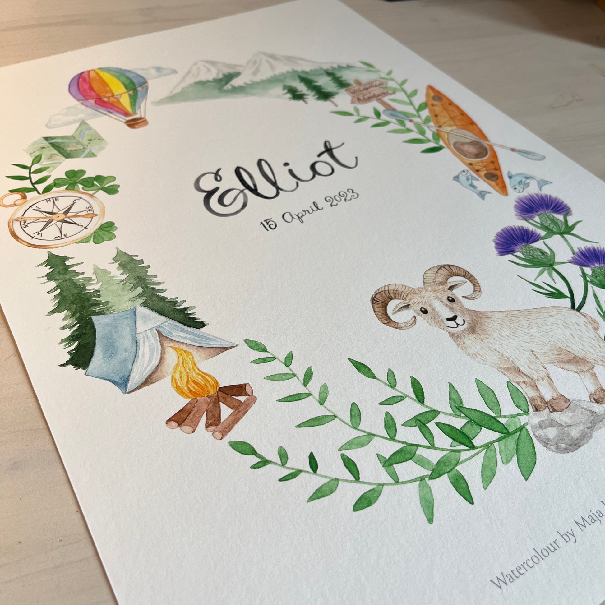 Watercolour name print for the nursery with an outdoor adventure theme. The poster features a ram as the symbol for the adventurous zodiac sign Aries, but is suitable for any child who loves outdoor adventures. Come along on a camping trip to explore magical forests and towering mountains, swim in wild rivers, sing by the bonfire and sleep under the stars. The illustration includes a hot-air balloon overlooking mountain tops, a compass to guide our adventure into the wild, a bonfire at the camp-site and fish jumping out of the river next to a kayak.
