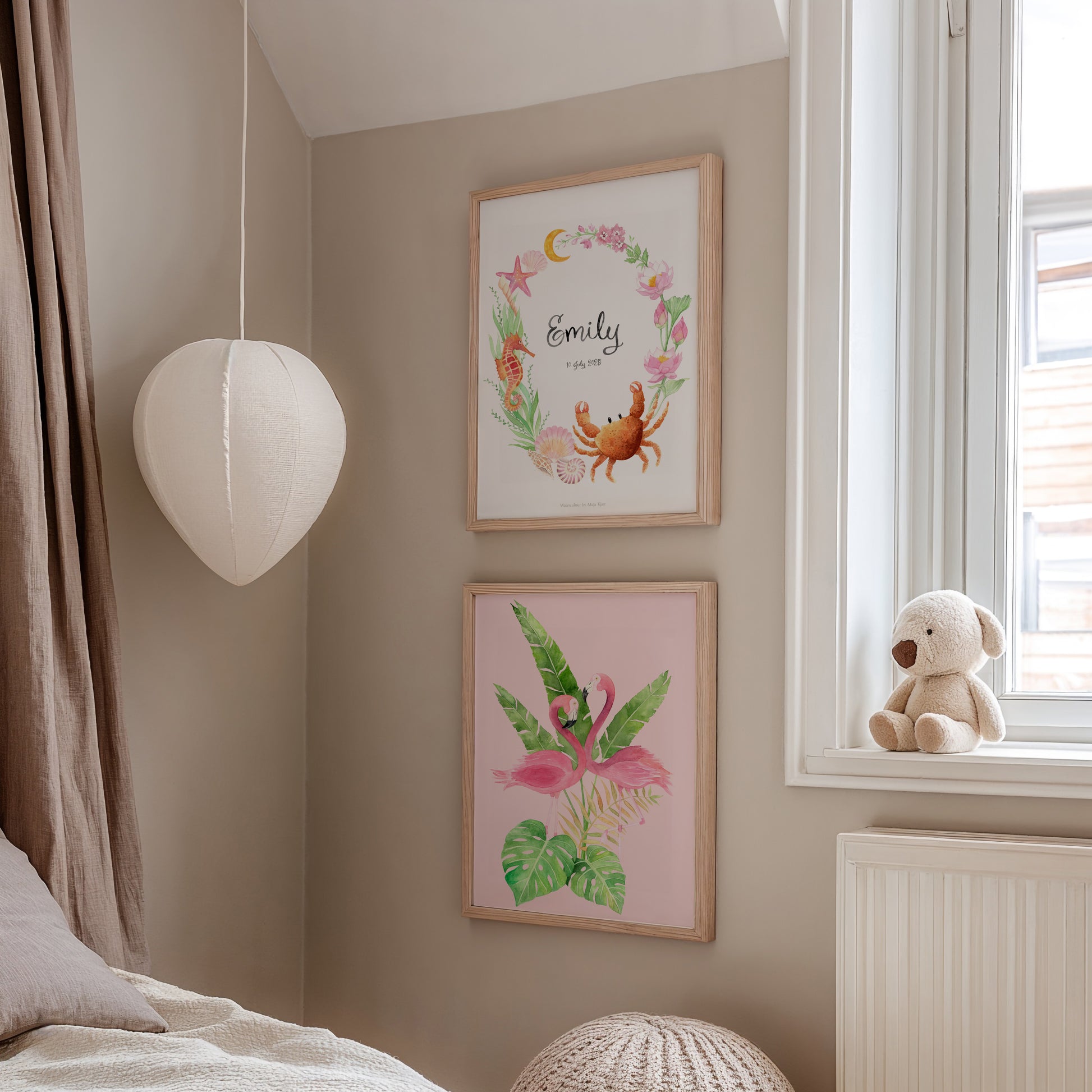 This is the watercolour painting that sparked the idea of creating Children's name posters in the first place. I initially made this name poster for my youngest niece, and the original is now decorating the wall in her room. Her zodiac sign is Cancer, and so the poster features a cute crab, the symbol of Cancer. As Cancer is a water sign, the poster is inspired by life under the sea, with sea shells, sea weeds, a sea horse and a starfish. On the right side I have painted the flowers larkspur and water lily.